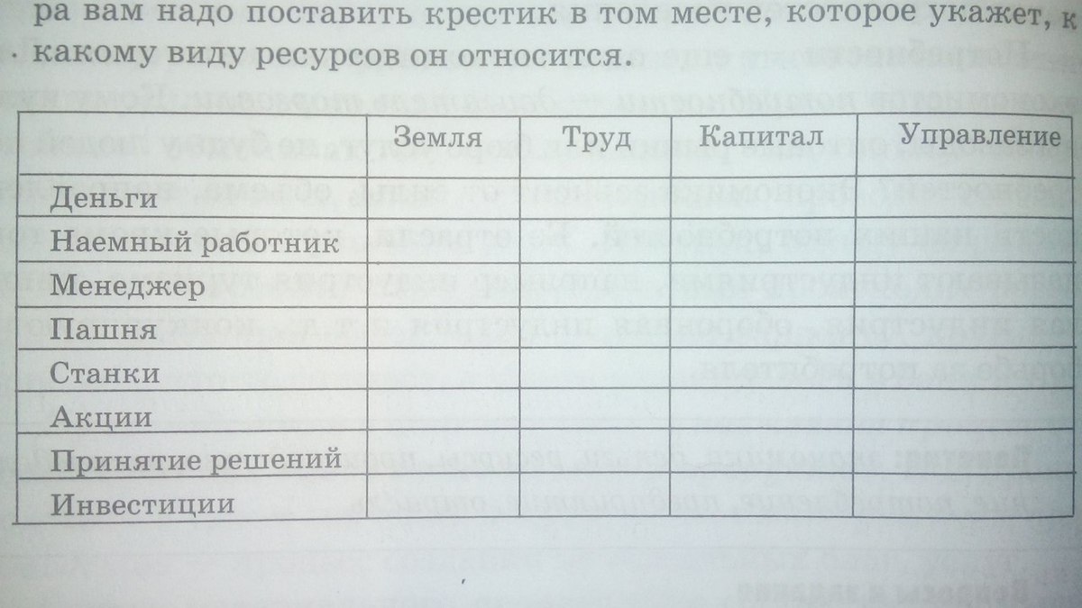 Что такое Ресурсы экономики и какую роль они играют? Попробуйте проанализировать виды ресурсов с помощью таблицы. Напротив каждого названного в столбце экономического фактора вам надо поставить крестик в том месте, которое укажет, какому виду ресурсов относится.