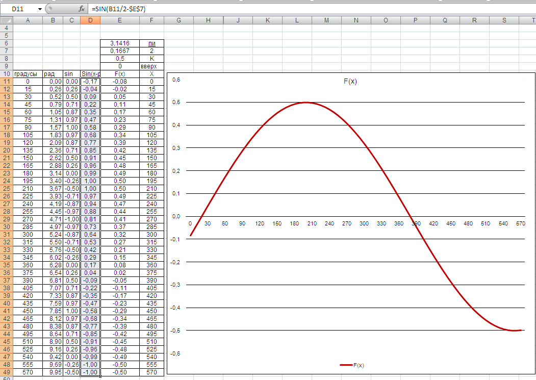 Раздели по оси Х каждые 30 градусов. Там нарисовано. Раздели вторую ось по 0,1 до 0,5 = это максимальное значение У. А в моей таблице сбоку есть значения и для Х (в градусах) и для У. Значения У округляй. 30 град = 0,05 и 60 град = 0,17 и далее. Важен МАСШТАБ по вертикали - растягиваем по вертикали.
