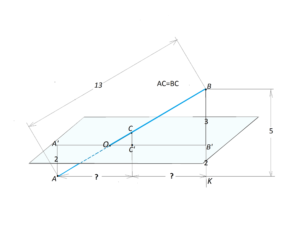 Концы отрезка АВ расположены по разные стороны от плоскости альфа и удалены от нее на 2 см и 3 см. Точка С-середина АВ. Найдите проекции отрезков АС и ВС на плость альфа, если АВ=13см.