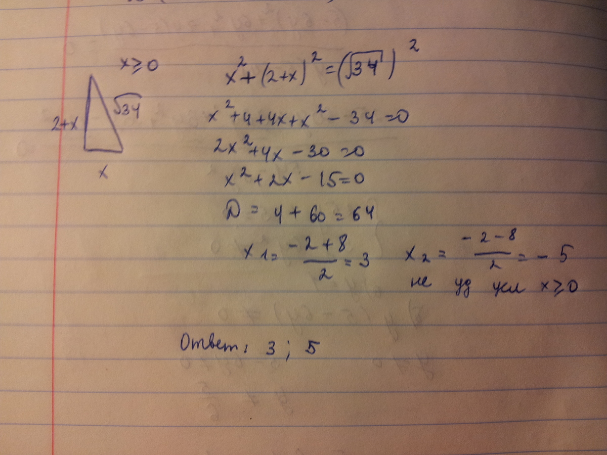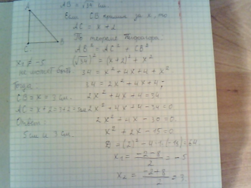 один из катетов прямоугольного треугольника на 2 см больше другого.Найдите катеты если гипотенуза равна квадратный корень из 34 см
