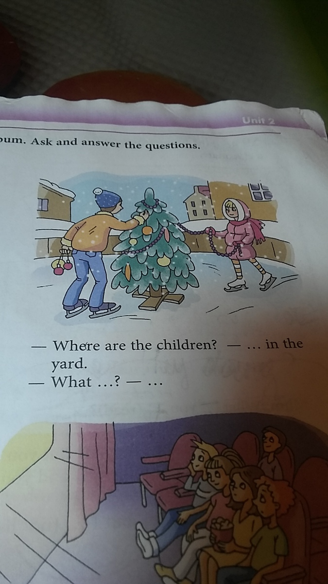 (Чем они занимаются?-Они катаются на коньках.Они украшают новогоднюю елку на люду)