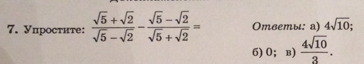frac{ sqrt{5} + sqrt{2} }{ sqrt{5} - sqrt{2} } - frac{ sqrt{5} - sqrt{2} }{ sqrt{5}+ sqrt{2}  } = frac{( sqrt{5}+ sqrt{2}  )^2  )-( sqrt{5} - sqrt{2} )^2}{( sqrt{5} - sqrt{2} )( sqrt{5}+ sqrt{2}  )} = frac{(5+2 sqrt{10}+2 )-(5-2 sqrt{10}+2 )}{5-2} = frac{4 sqrt{10} }{3}