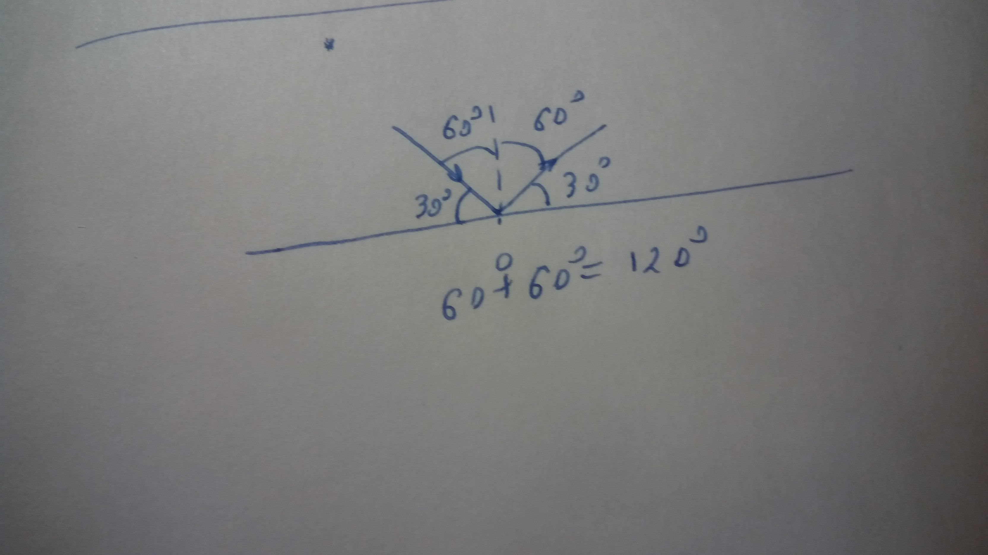 Если свет падает на плоское зеркало под углом 30 градусов к его плоскости, то чему равен угол между падающим и отраженным лучами?