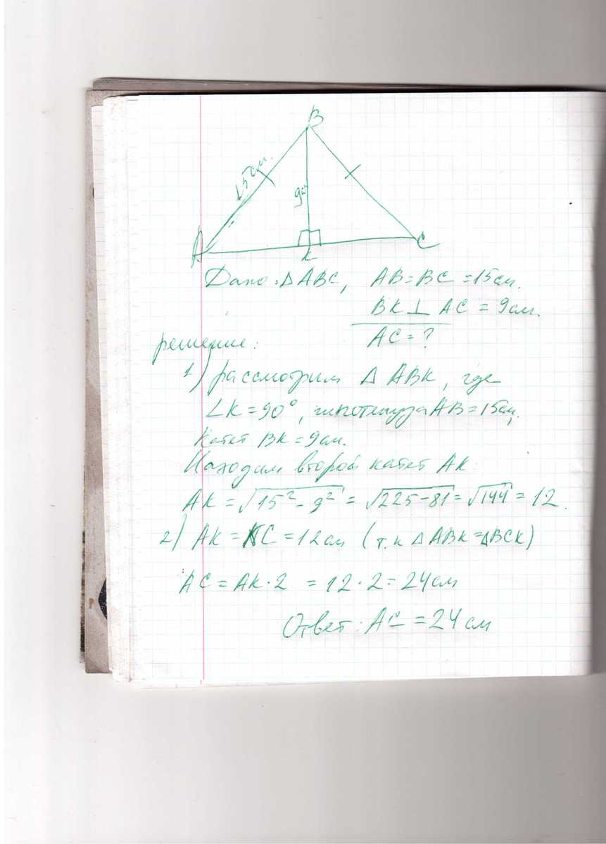 Боковая сторона равнобедренного треугольника равна 15 см, а высота проведенная к основанию 9 см,найти основание желательно подробно