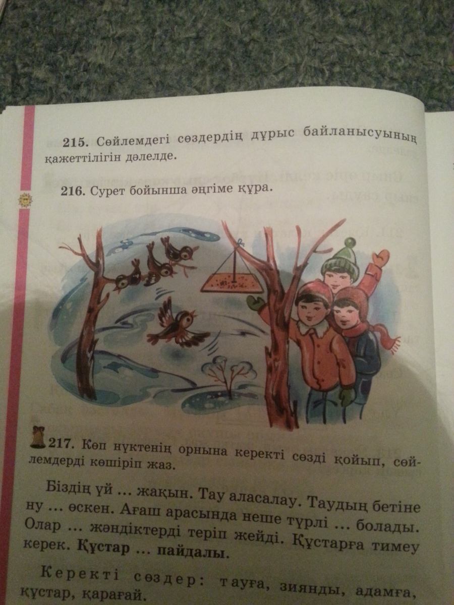 Қыс мезгили келди . Балалар далада ойнап аққалақ жасап жур . Саша Олег жәнеде айбек құстарға жем салатын үйшік истеди . Олар оте қуанды ойткени олар игілік ис истеди . Құстарға ұшып келип жемді жеді . үлкендер балалардың не истеген ин корип оте қуанды . Адам миримди болуы керек