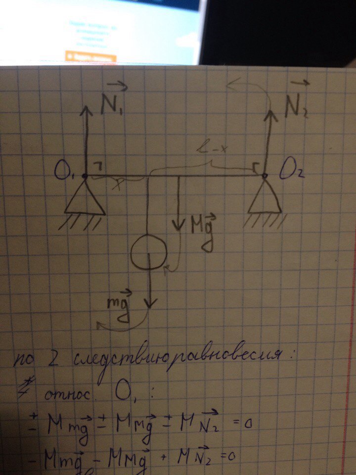 3) На трубе длиной 6 м и массой 120 кг на расстоянии 2 м от одного из ее концов подвешен груз массой 1 кг. Концы трубы находятся на опорах. Определите силы реакции опор.