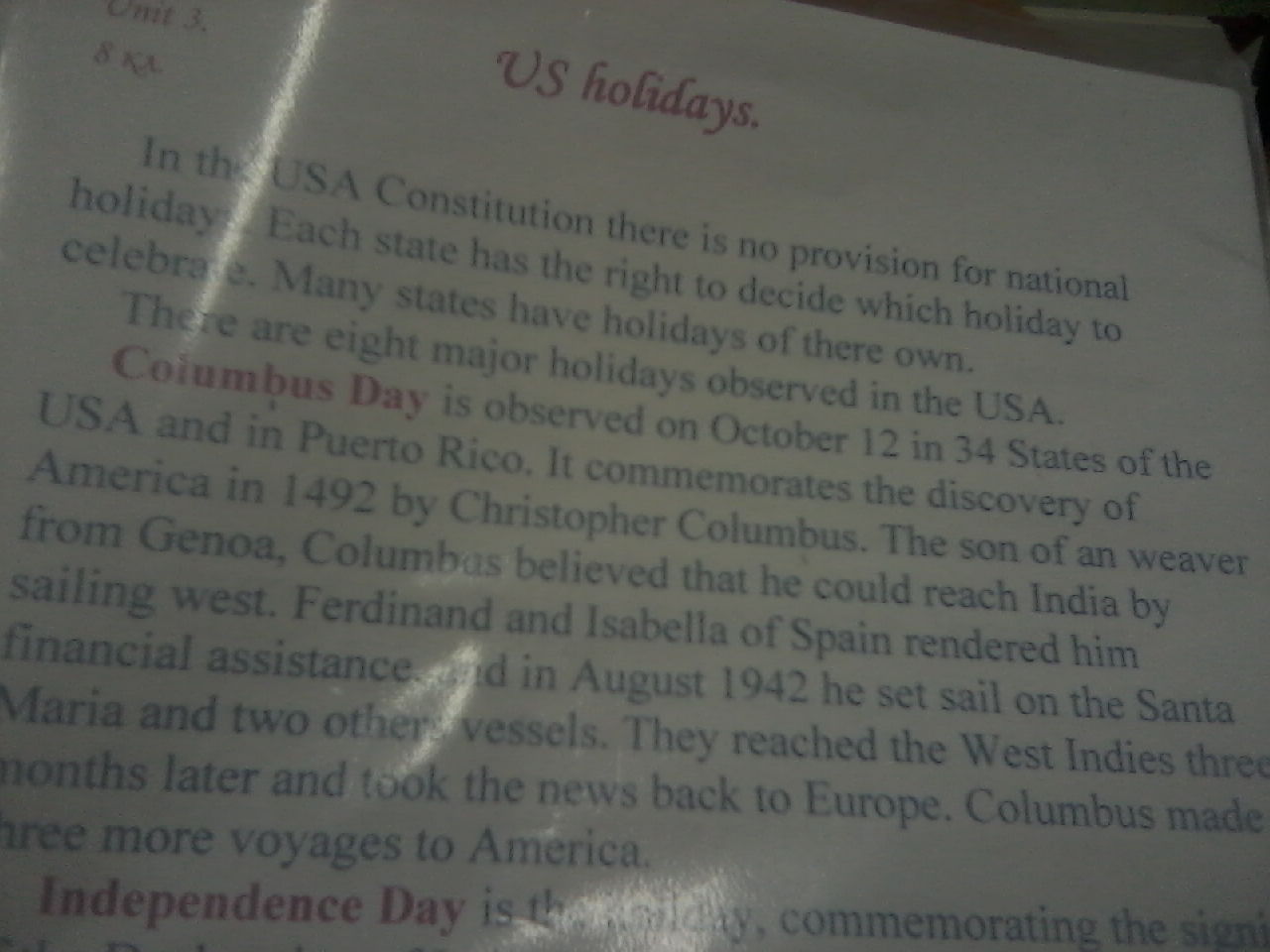 День Колумба отмечается 12 октября в 34 штатах Америки и в Пуэрто-Рико. Этот праздник ознаменовывает открытие Америки в 1492 году Христофором Колумбом. Сын ткача из Генуи, Колумб полагал, что может достичь Индии плывя на запад. Фердинанд и Изабелла, исанские правители, спонсировали его, и в августе 1492 (наверное в тексте опечатка, там написано 1942! ) он выезжает на Санте-Марии и других судах. Через три месяца они достигли берегов Западной Индии ( Вест- Индии) и привезли эту новость обратно, в Европу. После этого Колумб совершил ещё три плаванья к берегам Америки.