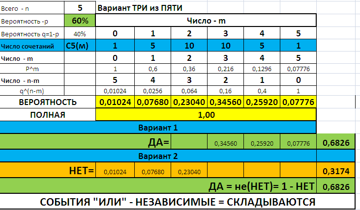 P(3)=C5(3)*p*p*p*q*q = 10 *0.6^3 * 0.2^2 = 0.3456 - ТОЛЬКО три человека.