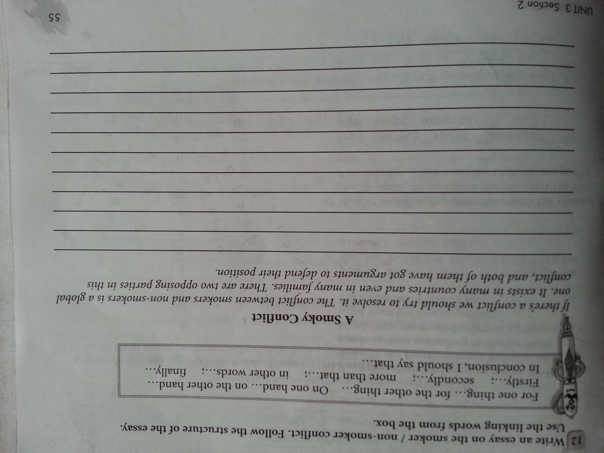 Нужно написать эссе о вреде курения или точнее о конфликте курящего и не курящего. Предложений 10. На английском конечно. Если можно, чтобы было легкое построение предложений. Фото- само задание и как нужно написать.