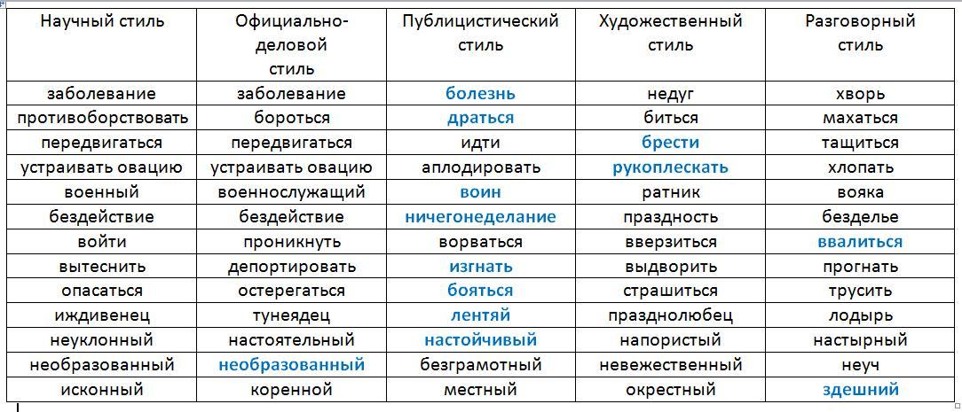 В таблице даны синонимы предложенных слов (по стилям речи).