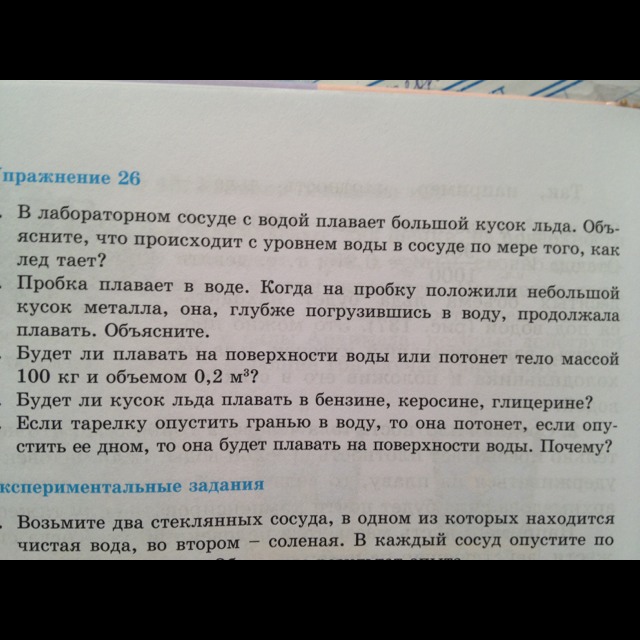3)Надо произвести расчет плотности p=m/v 100кг/0,2м^3=500 кг/m^3. Плотность воды 1000 кг/m^3. Значит тело будет плавать.