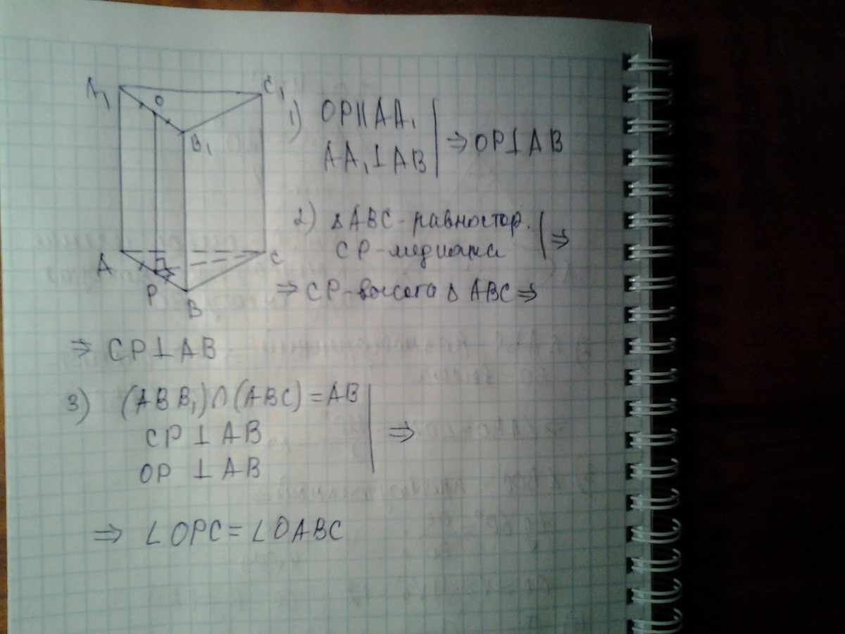 Точки O и P соответственно середины рёбер A1B1 и AB правильной треугольной призмы ABCA1B1C1. Докажите. что угол OPC является линейным углом двугранного угла OABC.
