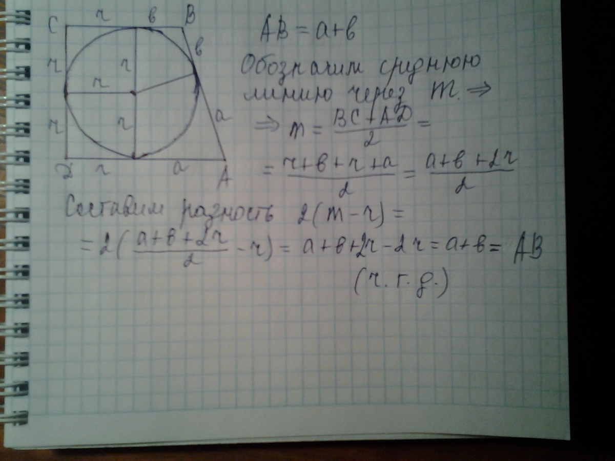 Докажите, что большая боковая сторона описанной прямоугольной трапеции равна удвоенной разнице средней линиии радиуса вписанной окружности.