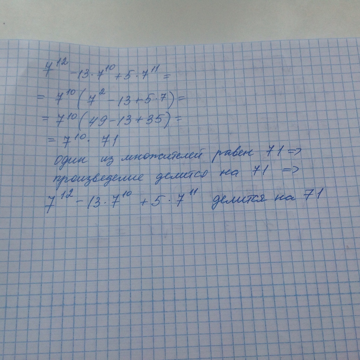 Верно ли, что значение выражения 7^12 - 13 * 7^10 + 5 * 7^11 делиться на 71