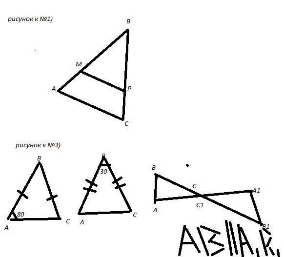 3) В первом случае - не подобны, поскольку углы первого равнобедренного треугольника равны 80°, 80°, 20°, а углы второго равнобедренного треугольника равны 75°, 75°, 30°