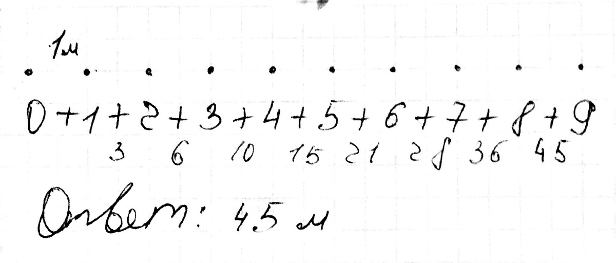 Это верно, но до десяти метров счёт не дойдёт, ведь первый орех не лежит на расстоянии 1 метра от дерева. Про это ничего не сказано. Значит будет: