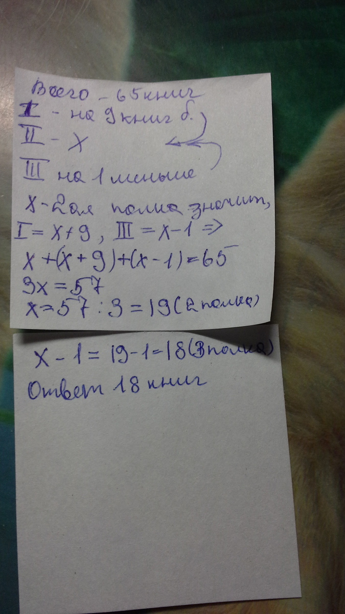 На 2-ой полке х на 1-ой х+9 на 3-ей х-1 х+х+9+х-1=65 3х=65-9+1 3х=57 х=19 На 3-ей полке 19-1=18 книг