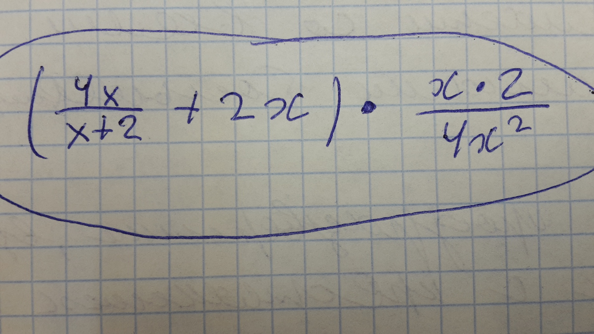 ( frac{4x}{x+2} +2x)* frac{2x}{4x^2} = ( frac{4x}{x+2} +2x)* frac{1}{2x} = frac{4x+2x(x+2)}{x+2} * frac{1}{2x} = frac{2x^2+8x}{2*x*(x+2)}=  \  \ = frac{2x(x+4)}{2x(x+2)} = frac{x+4}{x+2} = frac{x+2+2}{x+2} =1+ frac{2}{x+2}