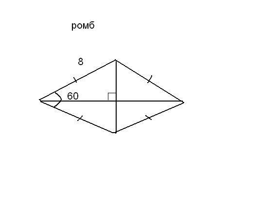 Ромб диагоналями делится на 4 равных прямоугольных треугольника с гипотенузой - сторона ромба. Диагонали - биссектрисы углов ромба. Диагонали в точке пересечения делятся пополам.