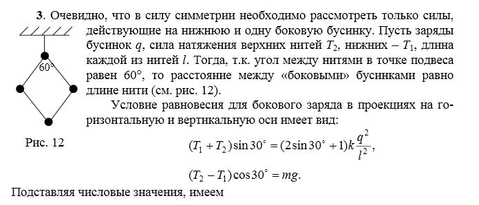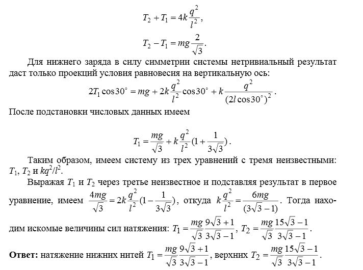 Четыре небольших одинаково заряженных бусинки массой m каждая соединили четырьмя одинаковыми непроводящими нитями и подвесили за одну из бусинок , при этом нити , идущие от точко подвеса , образовали угол 60 градусов . определите силы натяжения нитей.