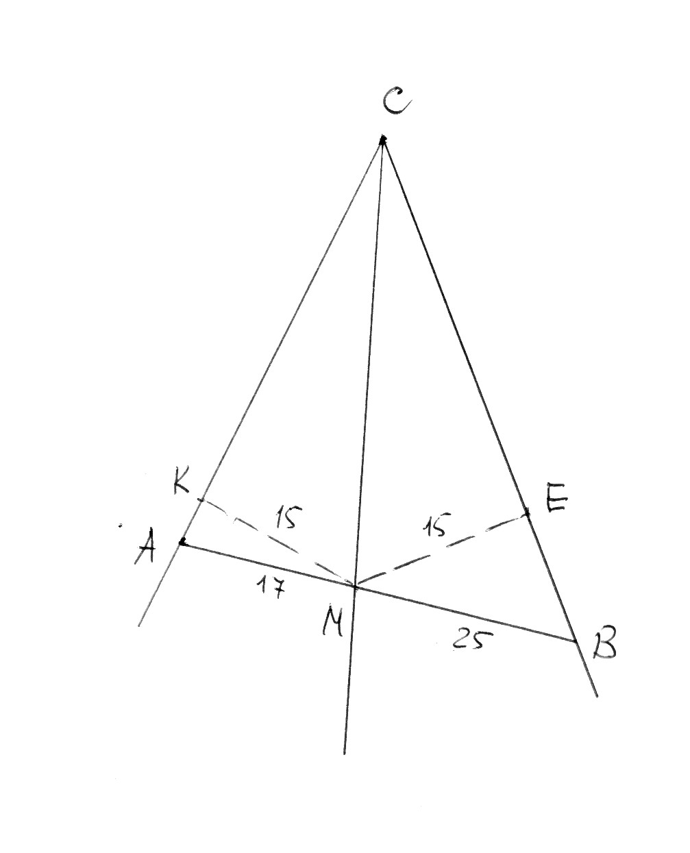 МК и МЕ - перпендикуляры из точки М на стороны угла АСВ, по условию МК = МЕ = 15.