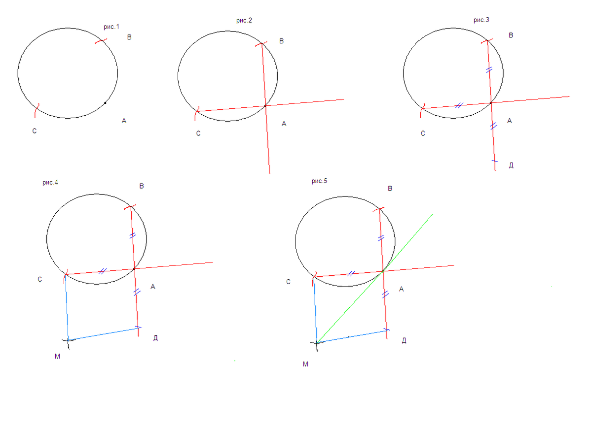 рис.4 из т.С и Д опять же таким же раствором чертим дуги, при пересечении дают точку М