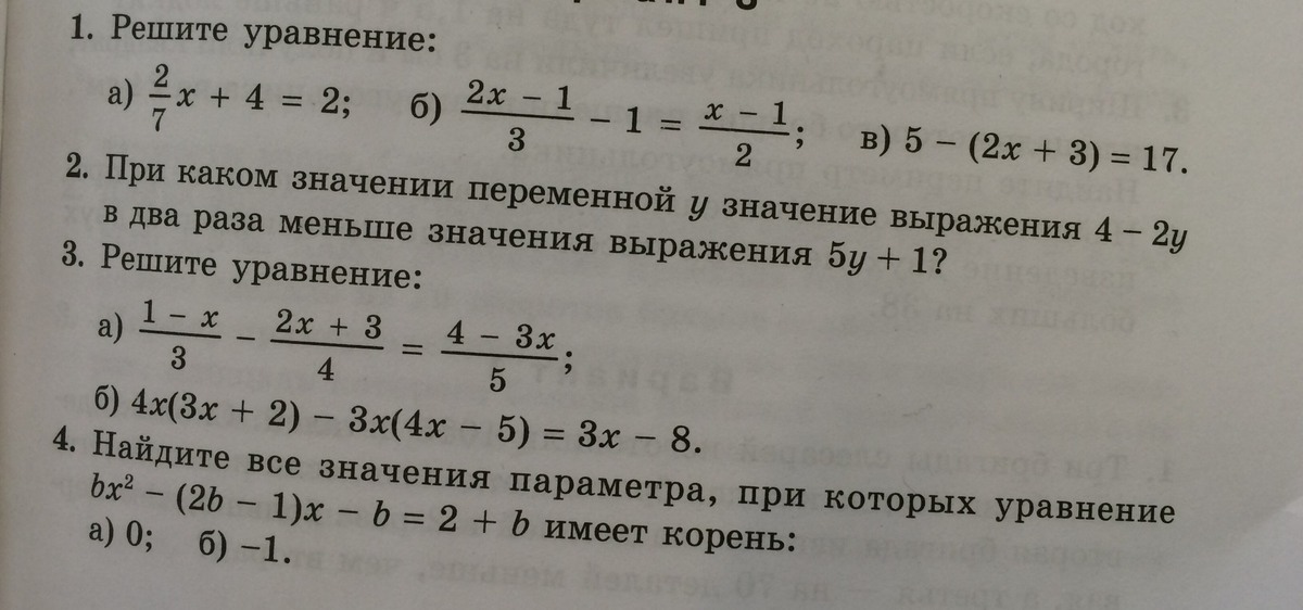 1. A) 2/7x + 4=2 => 2/7x = 2-4 => x= -2 / 2/7 => x=-2*7/2 => x= -7 B) (2x-1)/3 - 1 = (x-1)/2 => (2x-1)/3 - (x-1)/2 = 1 => ( (2x-1)2 - (x-1)3 ) / 6 = 1 => 4x-2-3x+3=6 => x=6+2-3 => x=5 C) 5-(2x+3)=17 => -(2x+3)=17-5 => 2x+3= -12 => 2x=-12-3 = x=-15/2 => x=-7.5