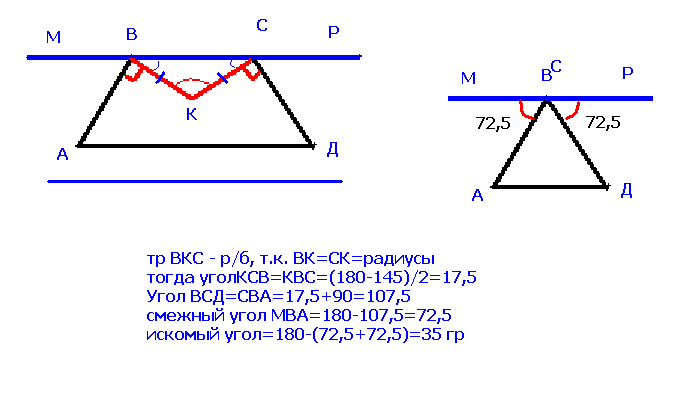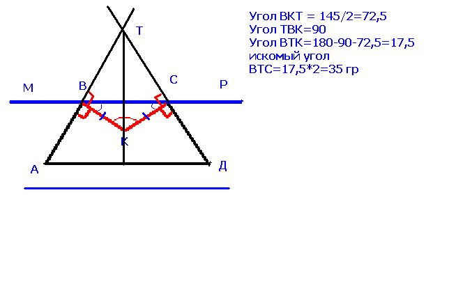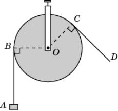 Груз A висит на шнуре, перекинутом через блок, изображенный на рисунке. Угол BOC равен 145 градусов. Чему равен угол между прямыми AB и CD?