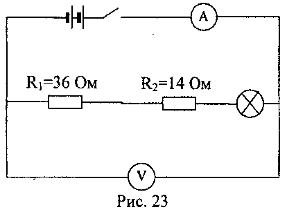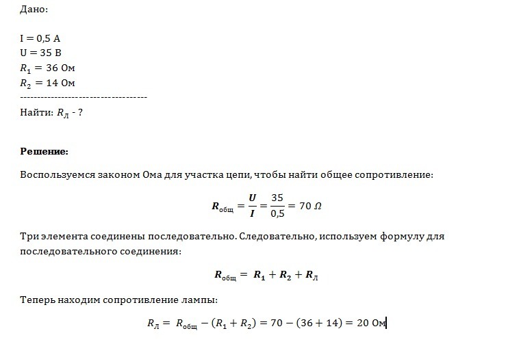 Каково сопротивление лампы, включенной в цепь, если амперметр показывает ток 0,5 А, а вольтметр, 35В?