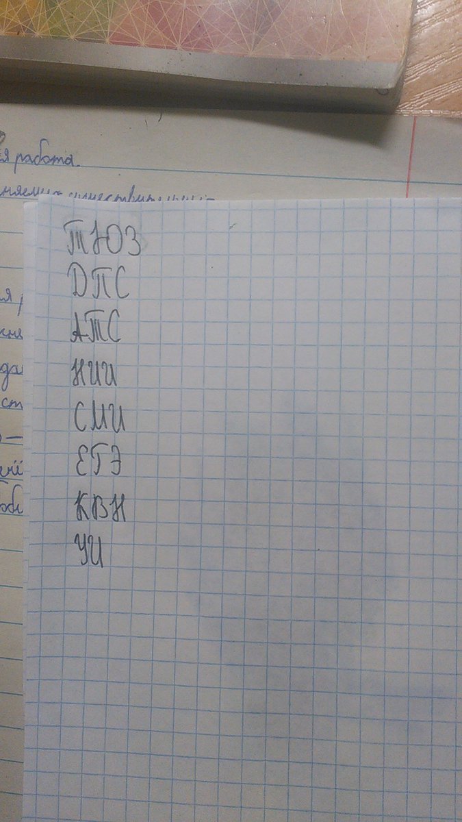 Театр юного зрителя. Дорожно-патрульная служба. Автоматическая телефонная станция. Научно-исследовательский институт. Средства массовой информации. Единый государственный экзамен. Клуб весёлых и находчивых. Ультразвуковое исследование.
