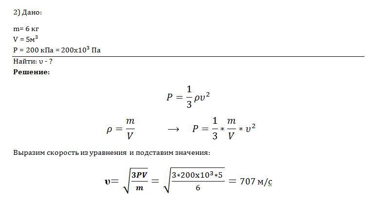 2) какова средняя квадратичная скорость движения молекул газа, если имея массу 6 кг, он занимает объем 5 метров кубических при давлении 200кПа ?