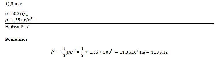 1)Каково давление азота, если средняя квадратичная скорость его молекул 500 м/с, а его плотность 1,35 кг/ на метр кубический.