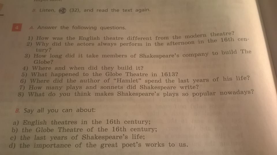 By that time Shakespeare already had a reputation of a poet and a dramatist, or playwright. Sadly, in 1613 during a performance The Globe caught fire, (4)... . They rebuilt it but soon the Puritans closed the theatre and (5)... .