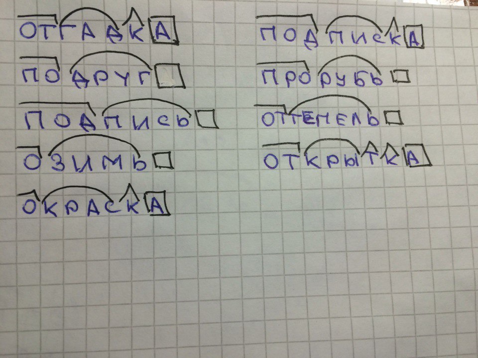 разбор слова по составу. Подруги, подпись, озимь, отгадка, окраска, подписка, прорубь, оттепель, открытка