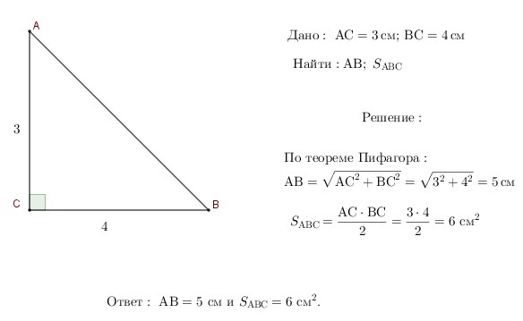 Катеты прямоугольного треугольника равны 3 см и 4 см .Найдите гипотенузу и площадь треугольника.(дано и рисунок тоже.)