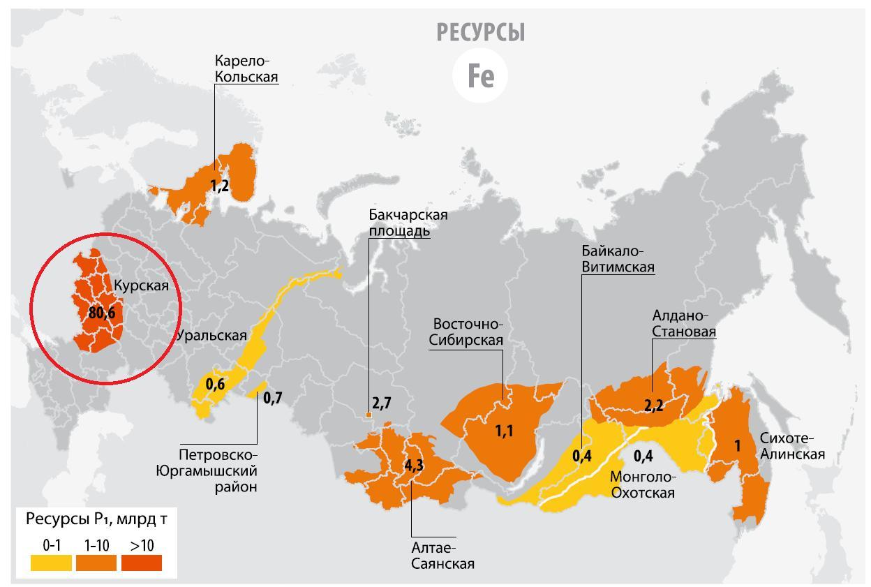 Крупнейшим месторождением железной руды в России считается Курская магнитная аномалия,которая расположена в пределах Восточно-Европейской равнины,в Курской,Орловской и Белгородской областях.В этом месторождении содержание железа в железной руде самое высокое,по сравнению с остальными базами (около 55-65%).