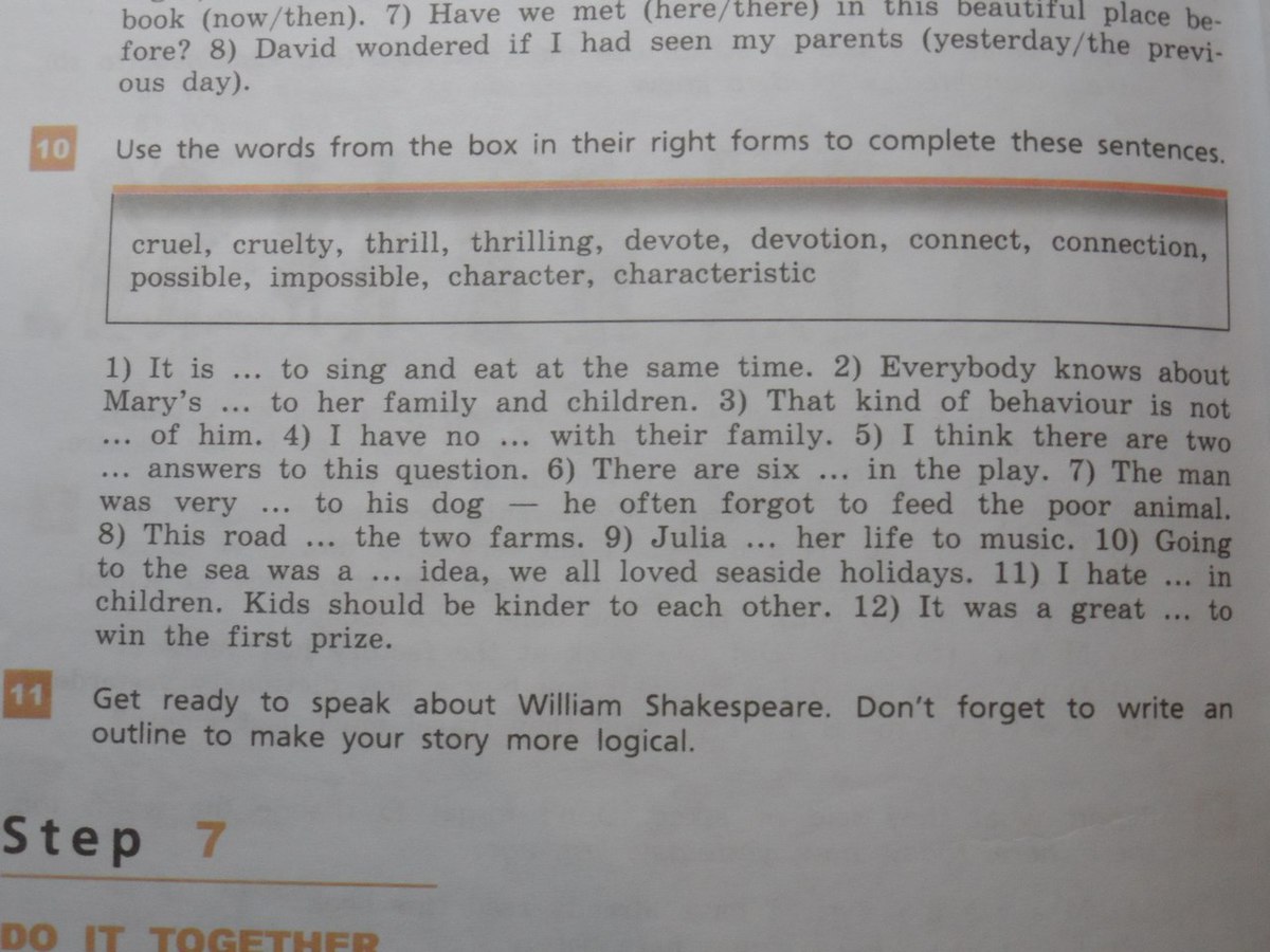 1) It is impossible to sing and eat at the same time. 2) Everybody knows about Mar's devotion to her family and children. 3) That kind of behavior is not characteristic of him. 4) I have no connection with their family. 5) I think there are two possible answers to his question. 6) There are six characters in the play. 7) The man was very cruel to his dog - he often forgot to feed the poor animal. 8) This road connects the two farms. 9) Julia devotes her life to music. 10) Going to the sea was a thrilling idea, we all loved seaside holidays. 11) I hate cruelty in children. Kids should be kinder to each other. 12) It was a great thrill to win the first prize.