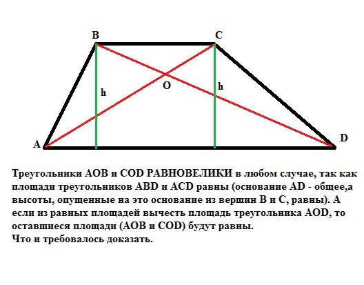 решить задачу по геометрии 9 класс онлайн бесплатно в трапеции авсд с основаниями ад и вс диагонали пересекаются в точке о. докажите ,что площади треугольников аов и сод равны