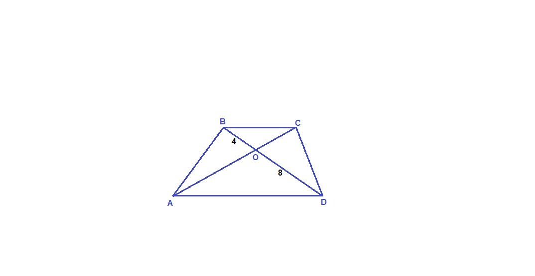 В трапеции ABCD с основаниями AD и BC диагонали пересекаются в точке O. BO=4 см, OD=8 см, AC=15 см. Найдите длины OC и AO