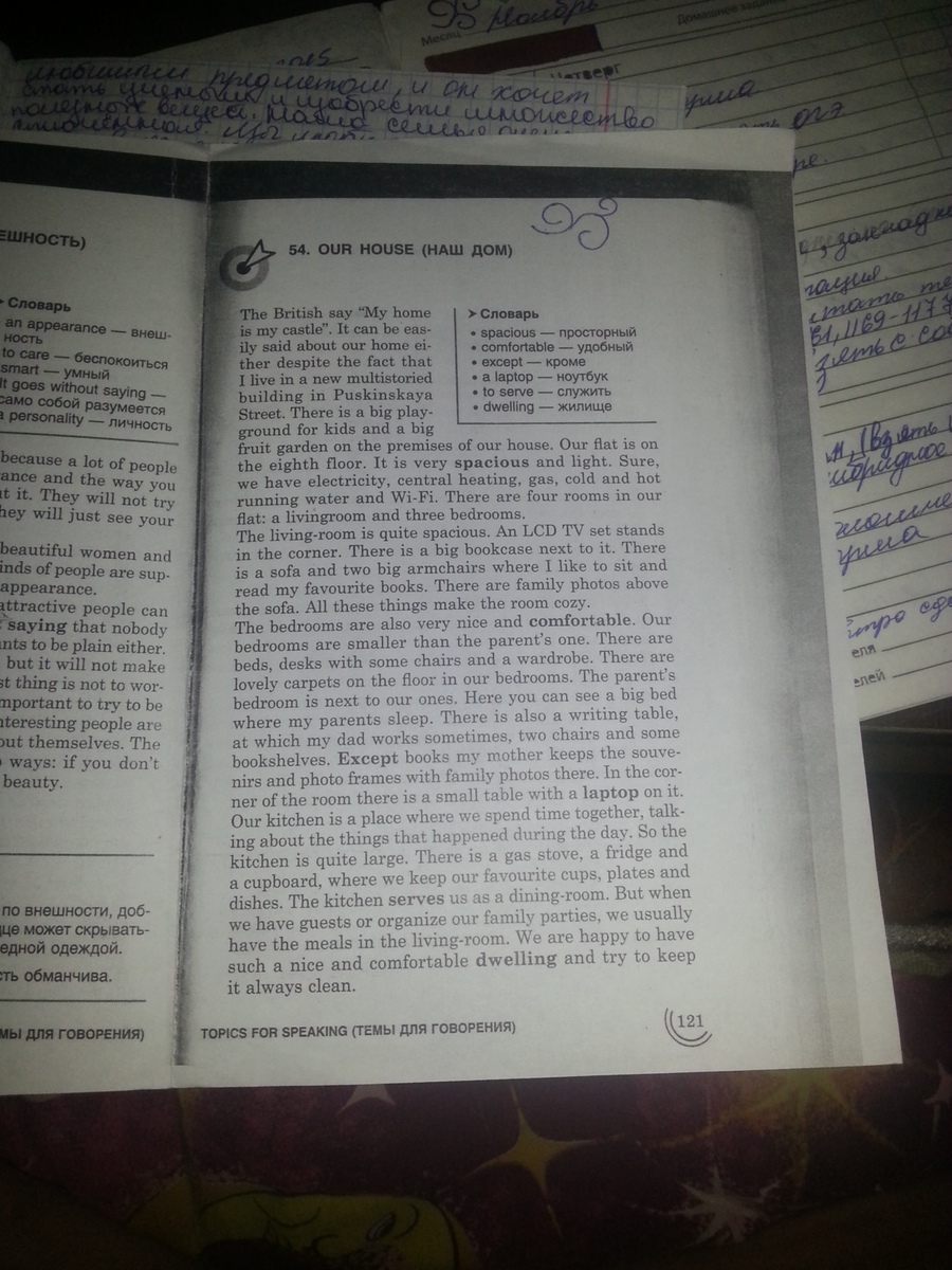 Британцы говорят: "Мой дом - это моя крепость". Так можно с лёгкостью сказать и о нашем доме, несмотря на тот факт, что что я живу в многоэтажном здании на Пушкинской улице. Там есть большая детская площадка и большой фруктовый сад, которым владеют жильцы нашего дома. Наша квартира находится на 8 этаже. Она очень просторная и светлая. Конечно, у нас есть электричество, центральное отопление, газ, холодная и горячая вода, вай-фай. В нашей квартире три комнаты: гостиная и две спальни. Гостиная достаточно просторная. Телевизор стоит прямо в углу, напротив него - большой книжный шкаф. Там есть диван и два больших кресла, на которых я люблю сидеть и читать свои любимые книги. Над диваном висят наши семейные фото. Все эти вещи создают уют в комнате. Спальные комнаты тоже очень милые и удобные. Наша комната меньше, чем комната наших родителей. Там есть кровати, столы, стулья и шкаф с одеждой. А ещё милые коврики на полу. Спальня родителей находится прямо напротив нашей. В ней стоит большая кровать, на которой спят наши родители. Ещё там есть письменный стол, за которым иногда работает мой отец, два стула и пара книжных полок. Кроме книг моя мама хранит там разные сувениры и фото в рамках. В углу комнаты находится маленький стол с ноутбуком. Наша кухня - место, где мы проводим время друг с другом, обсуждая вещи, которые случились за день. Кухня достаточнл большая. Там есть: газовая плита, холодильник, буфет, где мы храним наши любимые чашки, тарелки. Кухня служит нам столовой. Но когда к нам приходят гости или мы устраиваем вечеринку, то всегда кушаем в гостиной. Мы рады, что у нас такое хорошее и удобное жилище и мы всегда стараемся держать его в чистоте.