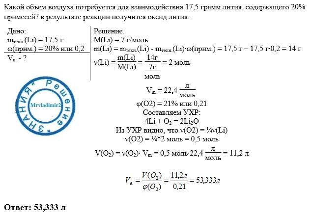 какой объем воздуха потребуется для взаимодействия 17,5 грамм лития, содержащего 20% примесей? в результате реакции получится оксид лития.
