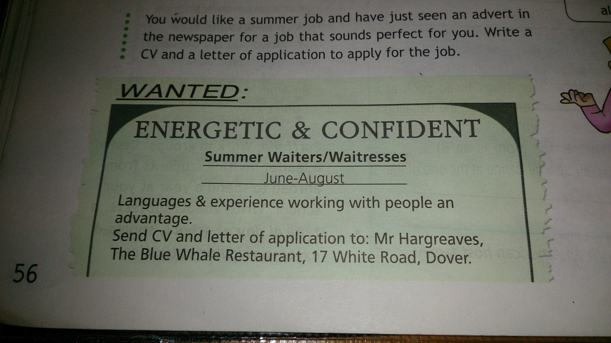 I am writing to apply for a Restaurant Waiter position at the Blue Whale for June-August, as advertised in the newspaper.