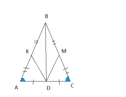 В равнобедренном треугольнике ABC точка K и M являются серединой боковых сторон AB и BC соответственно BD- медиана треугольника. Докажите что треугольник AKD=т. CMD! ПОМОГИТЕ ПОЖАЛУЙСТА!!!!