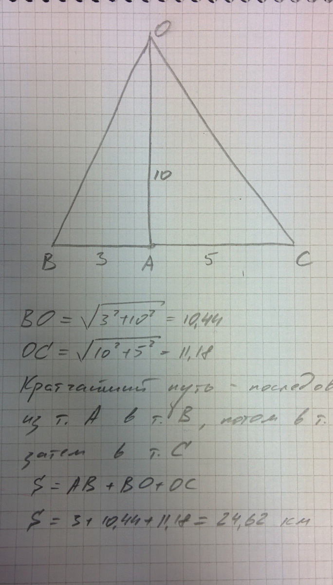 Камень в точке А, найти кратчайший путь через точки B, O и С. Ответ и решение на рисунке