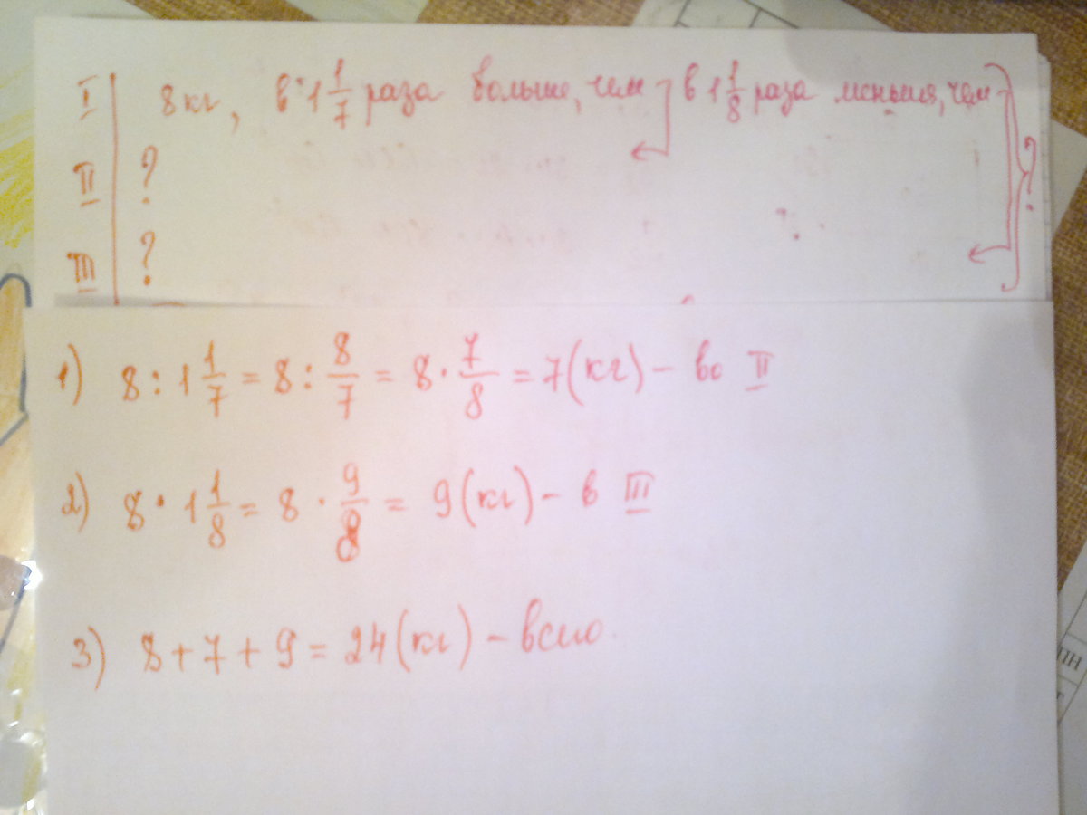 В первом ящике 8 кг винограда, что в 1 1/7 раза больше, чем во втором, и в 1 1/8 раза меньше, чем в третьем. Сколько килограммов винограда в трех ящиках?