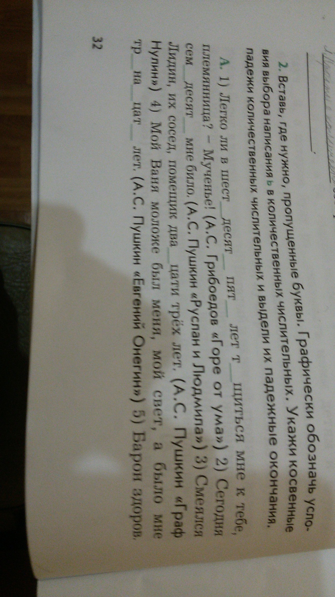 Вставь,где нужно,пропущенные буквы. Графически обозначь условия выбора написания ь в количественных числительных. Укажи косвенные падежи количественных числительных и выдели их падежные окончания. Русский язык. 6 класс. Самостоятельные и проверочные работы. Барова Е. С., Богданова М. Р. с 32-34 номер 2