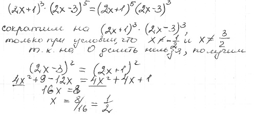 Решите уравнение:(2x+1)в 3 степени (2x-3)в 5 степени=(2x+1)в 5 степени(2x-3)в 3 степени -это все одно уравнение
