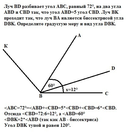 луч BD разбивает угол ABC, равный 72°, на два угла ABD и CBD так, что угол ABD=5 угол CBD. Луч BK проходит так, что луч BA является биссектрисой угла DBK. Определите градусгую меру и вид угла DBK.