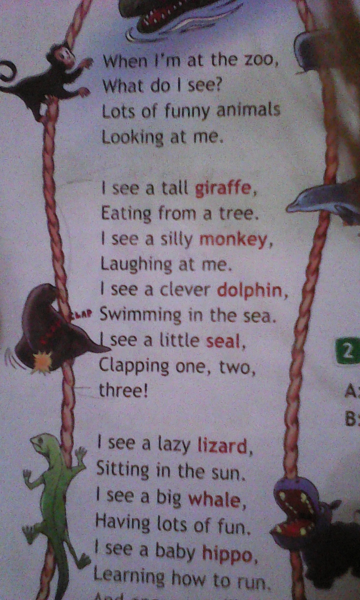 Когда я в зоопарке Что вижу? Много забавных животных глядя на меня. Я вижу высокий жираф, Еда из дерева. Я вижу глупую обезьяну, смеясь на меня. Я вижу умного дельфина, купание в море. увидеть немного печать Аплодисменты один, два, три! Я вижу ленивый ящерицу, Сидя на солнце. видим большой кит, имея много веселья. увидеть ребенка бегемота, Обучение, как работать.