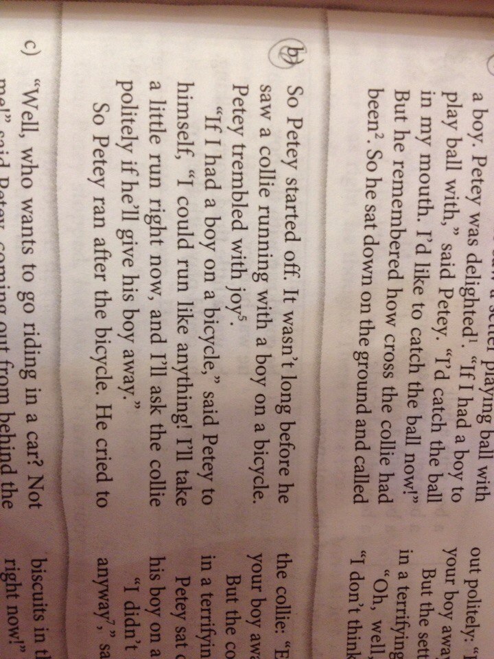 " Если бы у меня был мальчик на велосипеде- сказал Пити себе-я мог бы бежать как угодно.Я немного побегу прямо сейчас,и я попрошу колли вежливо может ли он отдать своего мальчика.Итак Пити побежал за велосипедом